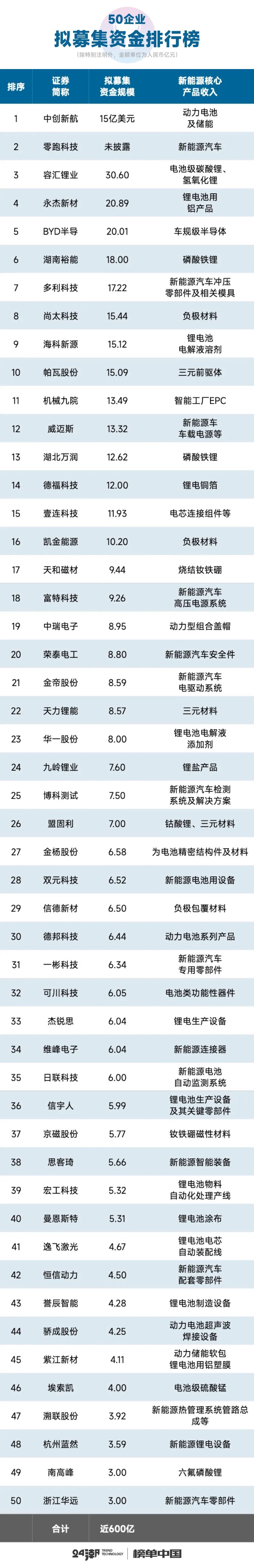 具體到企業(yè)層面,其中16家企業(yè)計(jì)劃募集資金規(guī)模在10億元以上,中創(chuàng)新航與零跑科技高居融資榜前兩位。