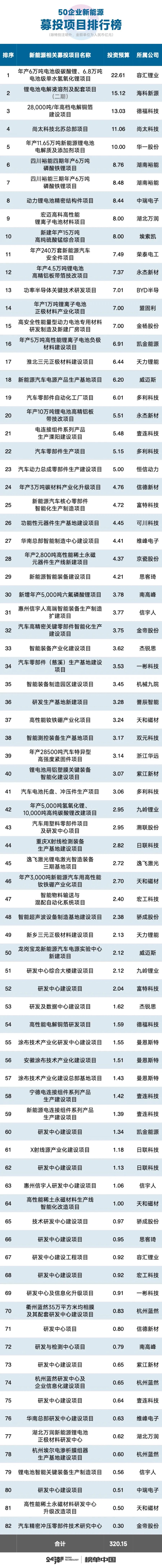 根據(jù)已披露的募投項(xiàng)目資料:只有5個(gè)項(xiàng)目的投資預(yù)算在10億元以上,前三大募投項(xiàng)目投資領(lǐng)域分別為碳酸鋰、鋰電池電解液溶劑和高檔電解銅箔,分屬于容匯鋰業(yè)、??菩略春偷赂?萍?。