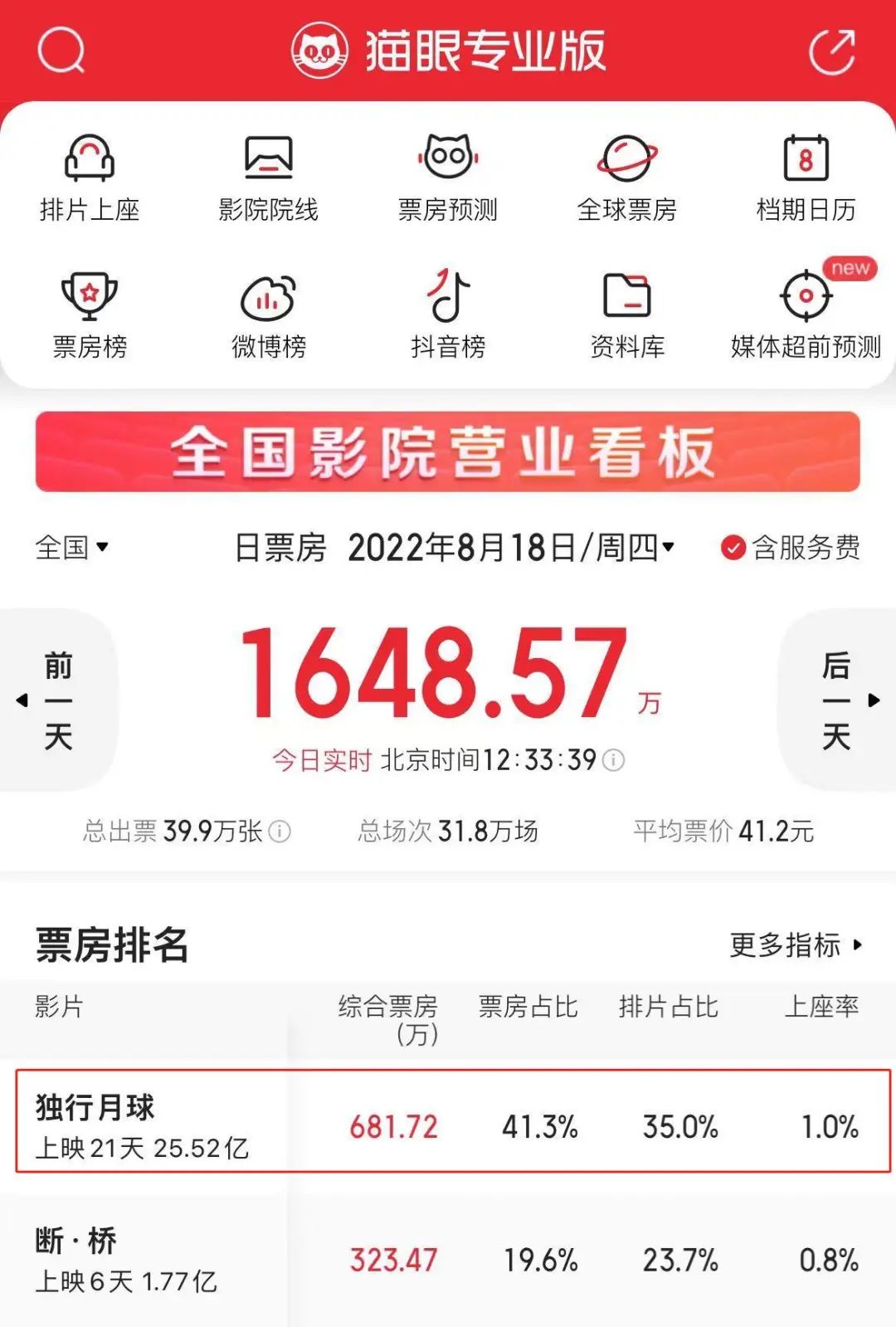 貓眼專業(yè)版實(shí)時(shí)數(shù)據(jù)顯示,截至8月18日12時(shí),《獨(dú)行月球》票房突破25.52億元,打破中國(guó)影史暑期檔科幻片累計(jì)票房等多項(xiàng)紀(jì)錄,按照目前的日均票房表現(xiàn),《獨(dú)行月球》票房達(dá)到預(yù)計(jì)的40億元應(yīng)該問(wèn)題不大。這讓自疫情以來(lái)持續(xù)低迷的電影市場(chǎng),迎來(lái)短暫的暑期觀影小高峰,讓人看到了行業(yè)復(fù)蘇希望。