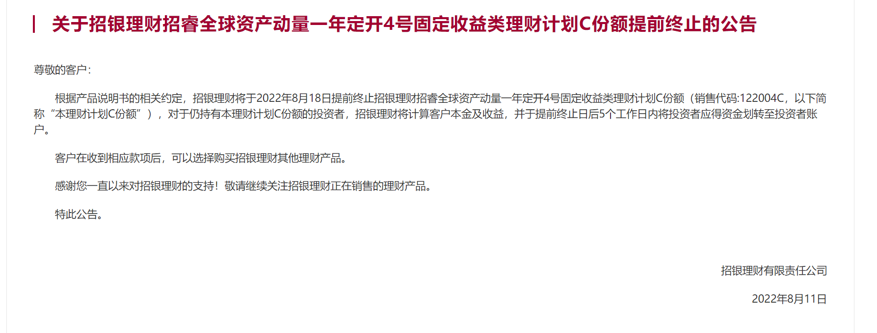 8月11日,招銀理財(cái)公告稱,于8月18日提前終止招銀理財(cái)招睿全球資產(chǎn)動(dòng)量一年定開4號(hào)固定收益類理財(cái)計(jì)劃C份額,對(duì)于仍持有該理財(cái)計(jì)劃C份額的投資者,招銀理財(cái)將計(jì)算客戶本金及收益,并于提前終止日后5個(gè)工作日內(nèi)將投資者應(yīng)得資金劃轉(zhuǎn)至投資者賬戶。