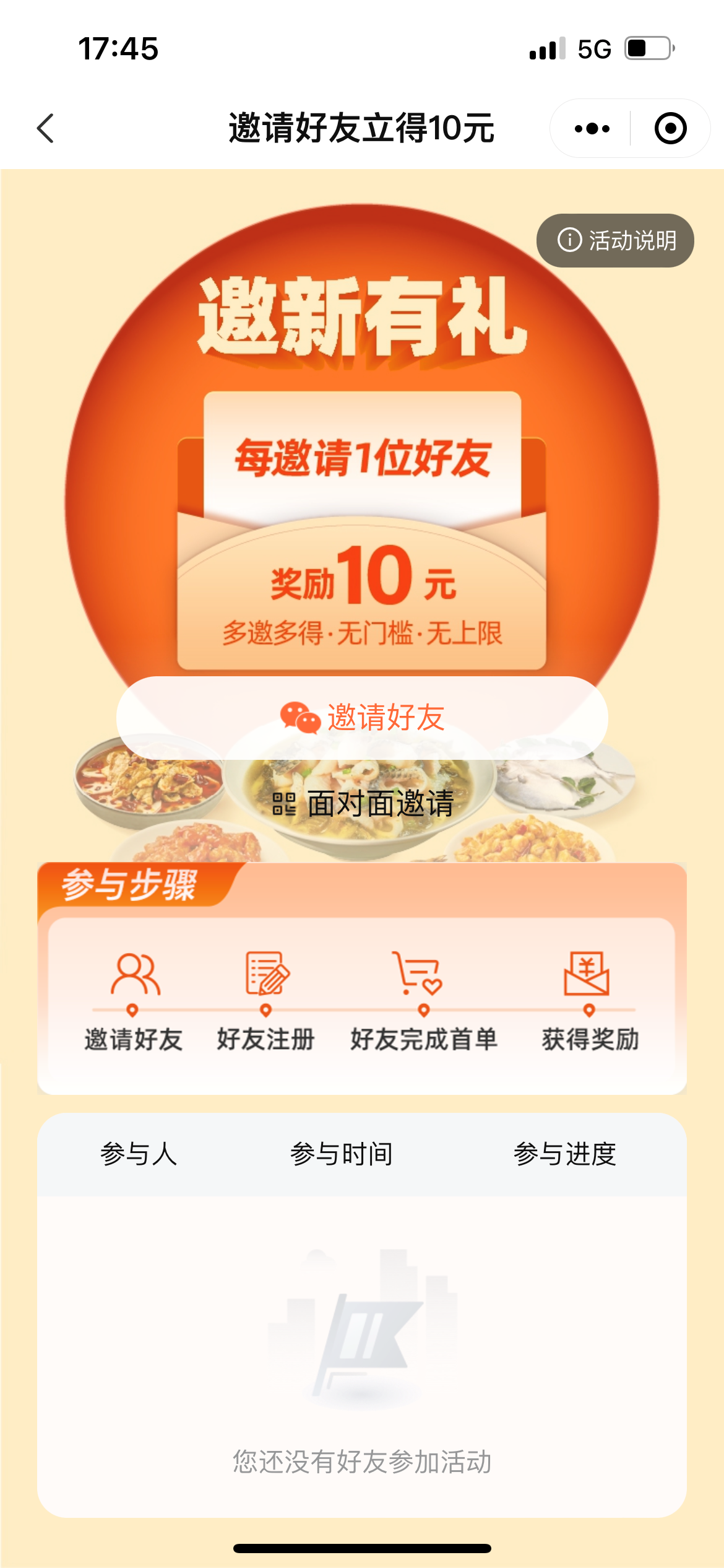 舌尖英雄小程序上顯示,每邀請一位好友,就可獲得10元獎(jiǎng)勵(lì)。這與當(dāng)年瑞幸的推廣方法“邀請好友可獲得獎(jiǎng)勵(lì)”如出一轍。
