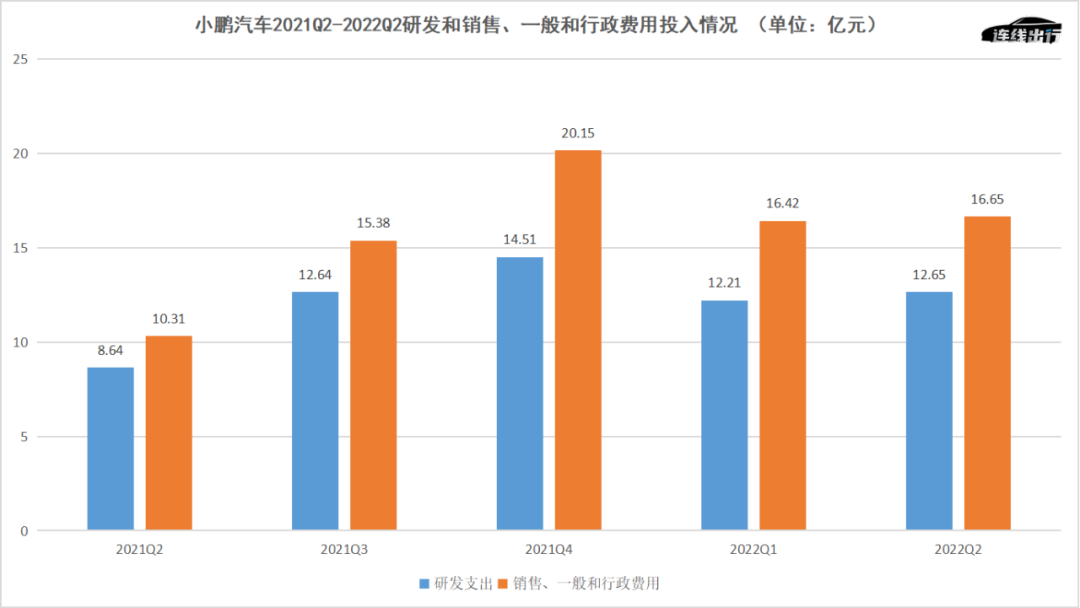 小鵬汽車2021Q2-2022Q2研發(fā)和銷售、一般和行政費(fèi)用投入情況,數(shù)據(jù)來(lái)源于公開(kāi)數(shù)據(jù),連線出行制圖