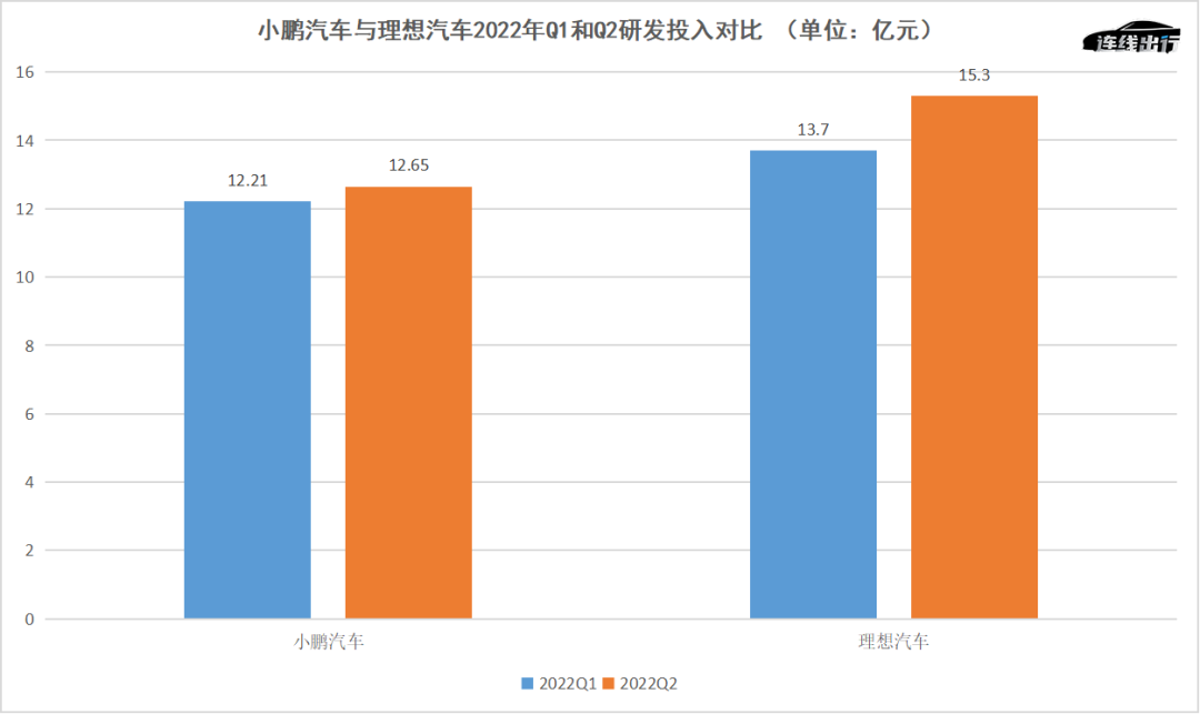 小鵬汽車與理想汽車2022年Q1和Q2研發(fā)投入對(duì)比,數(shù)據(jù)來(lái)源于公開(kāi)數(shù)據(jù),連線出行制圖