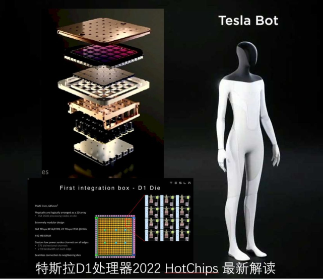 D1處理器由臺積電制造,采用7納米制造工藝,擁有500億個晶體管,芯片面積為645mm2,小于英偉達的A100(826 mm2)和AMD Arcturus(750 mm2)。要知道,這個D1處理器可是特斯拉人形機器人的核心,意義重大。