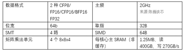 從18x20陣列中每個D1核心的結(jié)構(gòu)上看,每個D1核心是帶有向量計算/矩陣計算能力的處理器,具有完整的取指、譯碼、執(zhí)行部件。處理器運行在2GHz,具有4個8x8x4矩陣乘法計算單元。