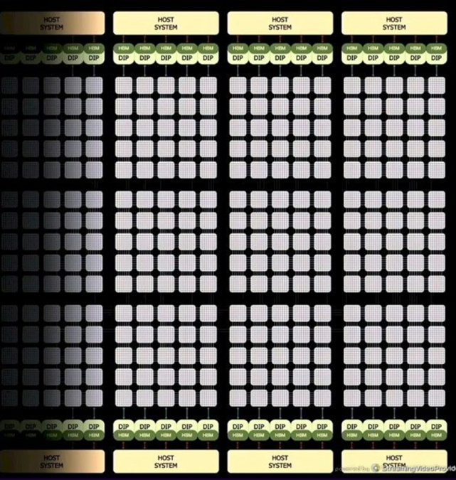 每個訓練模塊外部邊緣的 40 個 I/O 芯片達到了 36 TB/s的聚合帶寬,或者10TB/s的橫跨帶寬。