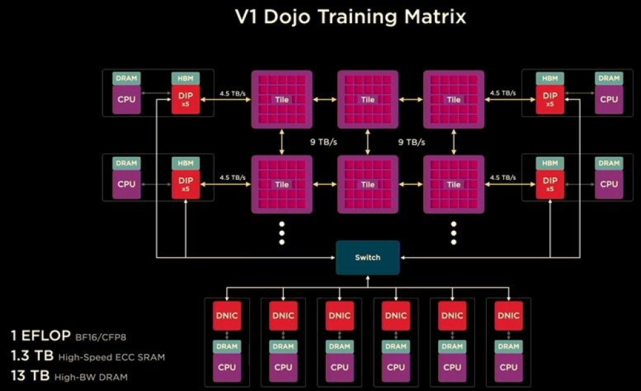 Dojo V1 訓練矩陣由 6 個訓練塊、4 個主機服務器上(裝有20個 DIP),以及一組連接到以太網(wǎng)交換結(jié)構(gòu)的輔助服務器構(gòu)成。