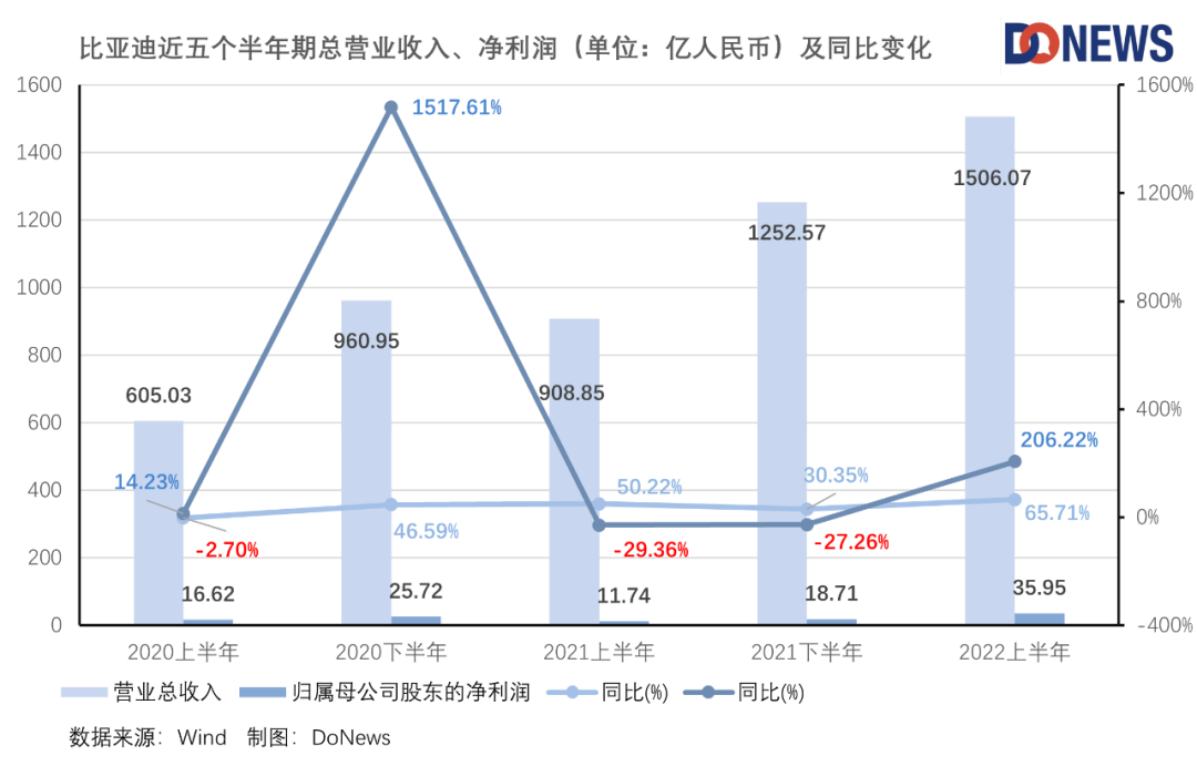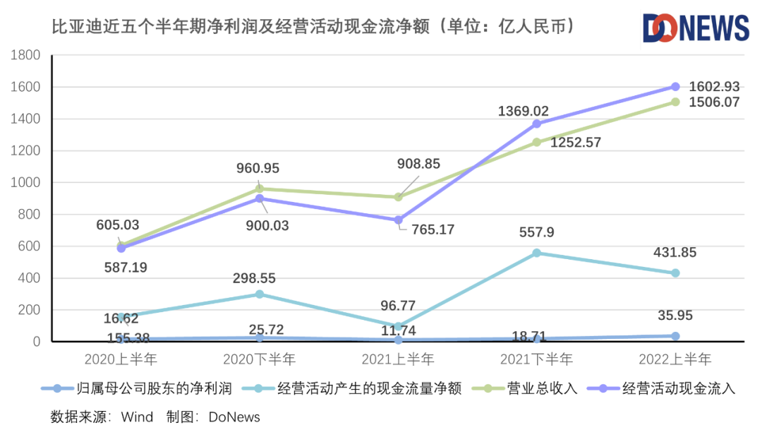 2022年8月29日晚間,比亞迪公布2022年上半年業(yè)績報告,據(jù)H股公告報告顯示,比亞迪在2022年上半年實現(xiàn)營收1506.07億元(人民幣,下同),同比增長65.71%;毛利203.41億,同比增長75.35%;歸母凈利潤35.95億,同比增長206.35%;扣非后歸母凈利潤30.29億元,同比增長721.72%%;每股盈利1.24元,同比增長202.44%;經(jīng)營活動現(xiàn)金流凈額431.85億,同比增長346.27%。