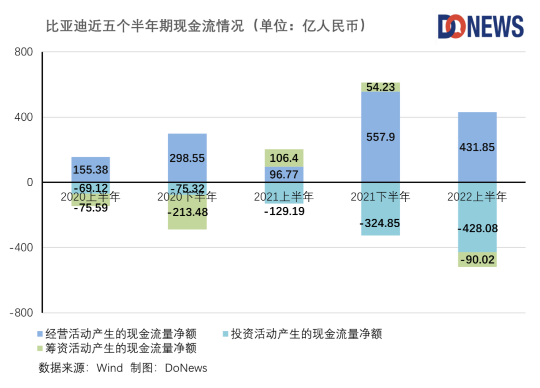 從現(xiàn)金流的狀況來看,2021年下半年,比亞迪現(xiàn)金流凈額達(dá)到287.28億元,即使近半年,現(xiàn)金流凈額為負(fù),但經(jīng)營現(xiàn)金流凈額仍高達(dá)431.85,賬上的現(xiàn)金及等價物達(dá)到446.86億元,同比增長了111.26%。