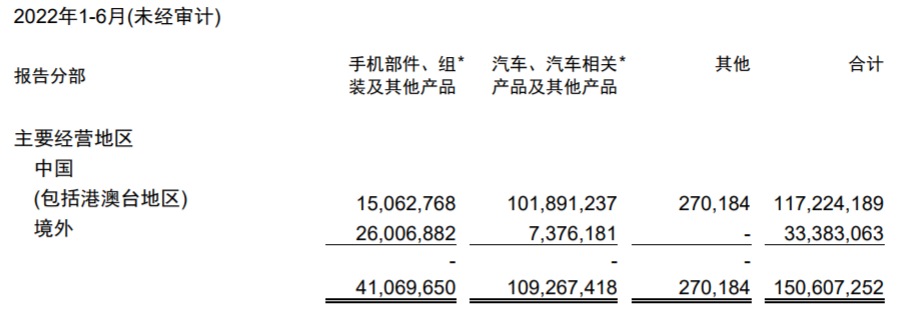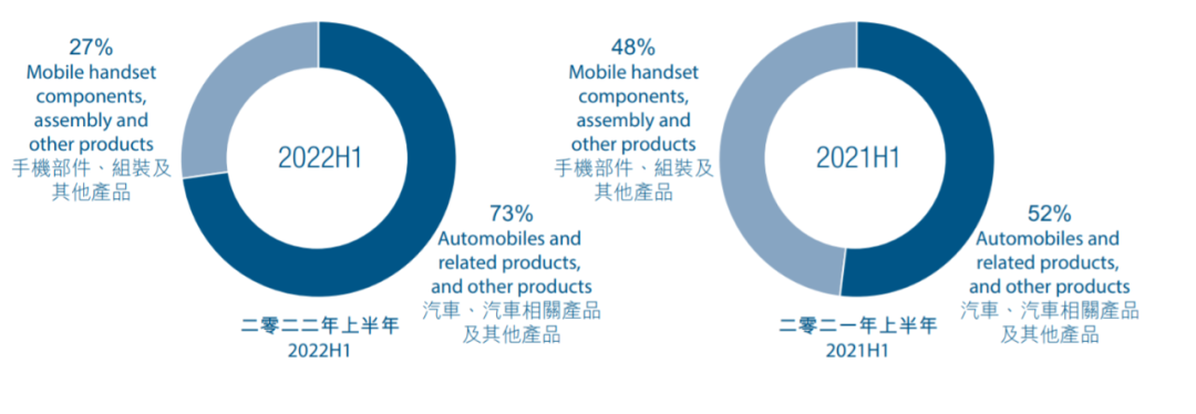 合并后的汽車業(yè)務(wù)包括制造和銷售汽車、汽車相關(guān)的模具及零部件、汽車租賃和汽車的售后服務(wù)、汽車動力電池、鋰離子電池、光伏產(chǎn)品以及鐵電池產(chǎn)品、軌道交通及其相關(guān)業(yè)務(wù)及防疫物資產(chǎn)品收入。2022年上半年,汽車業(yè)務(wù)的營收占比迅速攀升,從去年同期的52%,升至73%,手機(jī)部件、組裝等業(yè)務(wù)占比劇烈下滑,從48%下滑至27%。