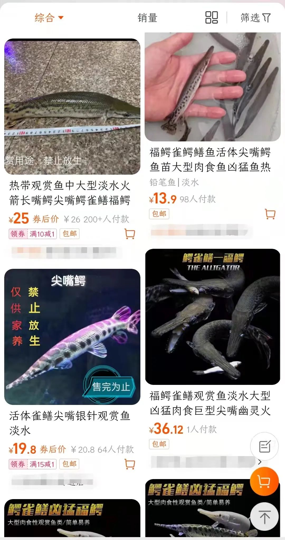 《中國企業(yè)家》注意到,目前在淘寶、京東等電商平臺上直接搜索“鱷雀鱔”已顯示無相關(guān)產(chǎn)品。但變換其中的一些詞,以“鱷雀扇魚”或“福鱷”等詞匯檢索,就能非常輕易檢索到相關(guān)的店鋪。身長43厘米左右的鱷雀鱔,價(jià)格達(dá)到438元,有店鋪在所售產(chǎn)品的圖片展示頁特意標(biāo)注“熱銷中”。