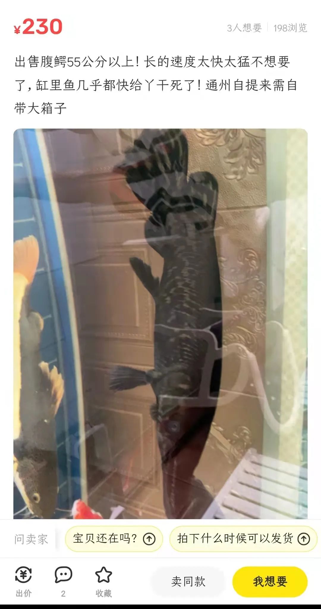 在二手交易平臺上,也有部分因養(yǎng)殖條件不足,被轉(zhuǎn)售的大型鱷雀鱔。有人掛出150元的價(jià)格,準(zhǔn)備出售體長40厘米的鱷雀鱔,稱“狀態(tài)很好,皮毛漂亮,就是太厲害了沒法養(yǎng)其他魚”。也有人以230元出售一條55厘米的鱷雀鱔,稱“長的速度太快太猛,不想要了”。