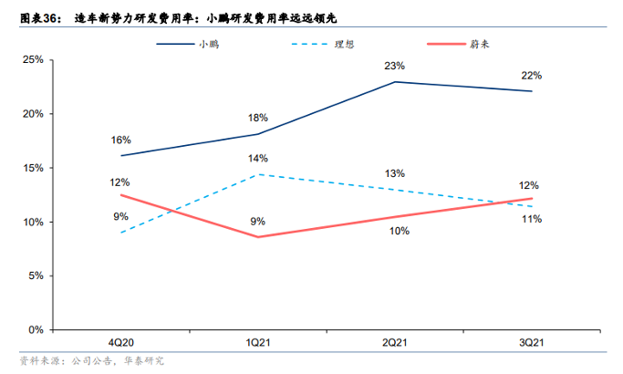 研發(fā)費(fèi)用最為直觀。2021年,小鵬汽車的研發(fā)費(fèi)用達(dá)41.1億元,占全年總營收的19.5%。對此,小鵬汽車向節(jié)點(diǎn)財(cái)經(jīng)表示,其為中國研發(fā)費(fèi)用占比最高的車企,遠(yuǎn)高于其友商,以及奔馳、寶馬等全球主流汽車品牌。