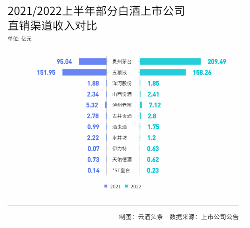 例如,業(yè)績穩(wěn)居三甲的洋河股份,在2022年上半年,實(shí)現(xiàn)直銷收入1.85億元,同比下降1.47%;經(jīng)銷收入達(dá)183.33億元,同比增長22.49%;其經(jīng)銷渠道在總營收占比達(dá)99%。