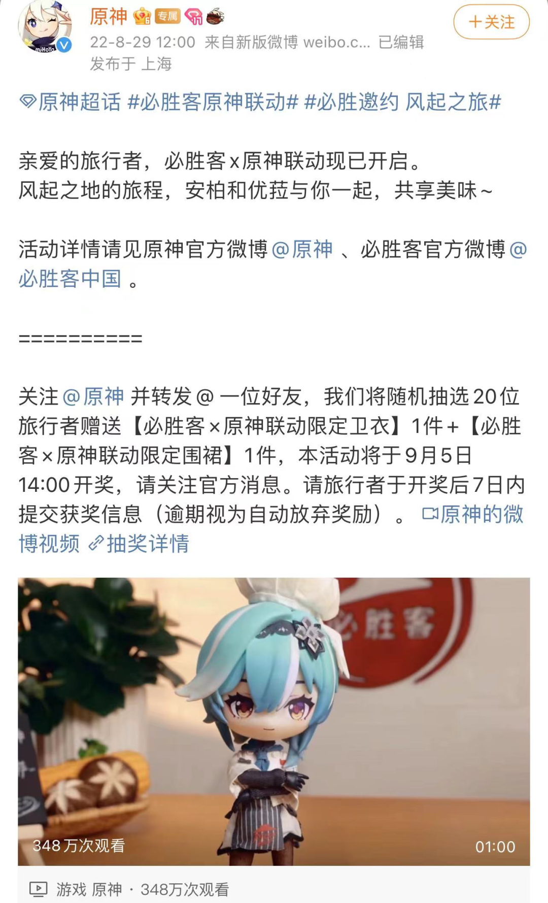 事情起源于8月29日,必勝客和原神進(jìn)行了官方聯(lián)動(dòng)。必勝客為原神推出了專門的主題套餐以及相應(yīng)活動(dòng)。同時(shí),玩家在購買套餐后,還有機(jī)會(huì)抽獎(jiǎng)獲得游戲中的道具等等。