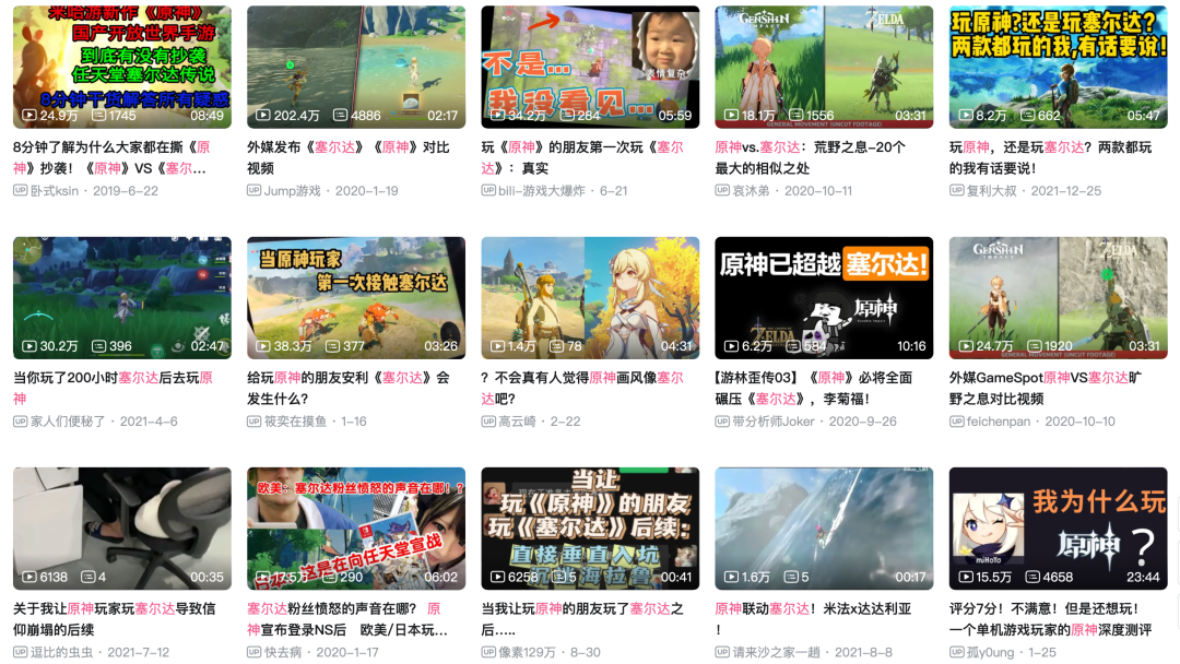 緊接著,眾多將原神的PV與塞爾達(dá)的視頻進(jìn)行剪輯對(duì)比的內(nèi)容開始在以B站為主的平臺(tái)大量產(chǎn)生。在這個(gè)ACG勢力頗為強(qiáng)大的地方,本來在國內(nèi)十分小眾的任天堂粉絲卻有著強(qiáng)大的能量,并迅速和以米哈游粉絲為主的原神粉展開了第一波輿論戰(zhàn)爭。