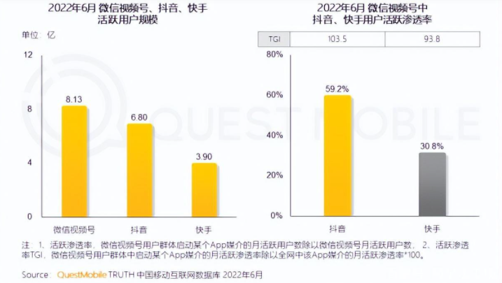 據Quest Mobile發(fā)布的《2022中國移動互聯網半年報告》,2022年6月,微信視頻號月活規(guī)模突破8億,抖音為6.8億,快手3.9億,抖音用戶滲透率達六成。這意味著依托于微信12億日活流量池,視頻號增長迅速,已然位列榜首。被完全納入微信生態(tài)之后,視頻與朋友圈、公眾號、看一看、搜一搜、企業(yè)微信、個人微信等全面打通,產生了更多的裂變式傳播可能,以及商業(yè)想象空間。