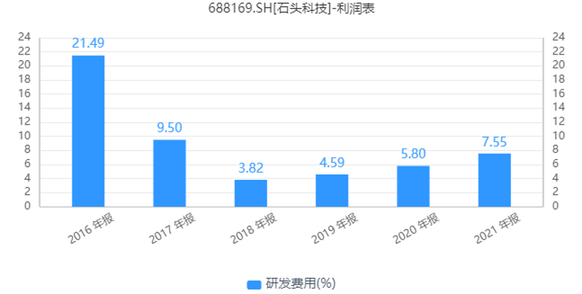 數(shù)據(jù)顯示,2016年-2017年,石頭科技研發(fā)費用率分別為21.49%和9.5%。但到了2018年,公司研發(fā)費用率就大幅下滑至3.82%。截至2021年,石頭科技研發(fā)費用投入占比為7.55%,尚未恢復(fù)至2017年度水平。