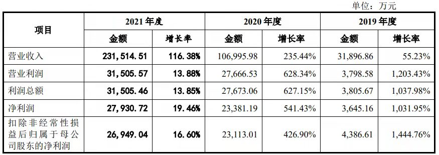 招股書顯示,過去三年,公司的營業(yè)收入分別為3.19億元、10.7億元和23.15億元,同比增速分別為55.23%、235.44%和11.38%,年均復合增速達到124.18%;凈利潤方面,則達到0.36億元、2.34億元和2.79億元,年均復合增速達到296.06%。