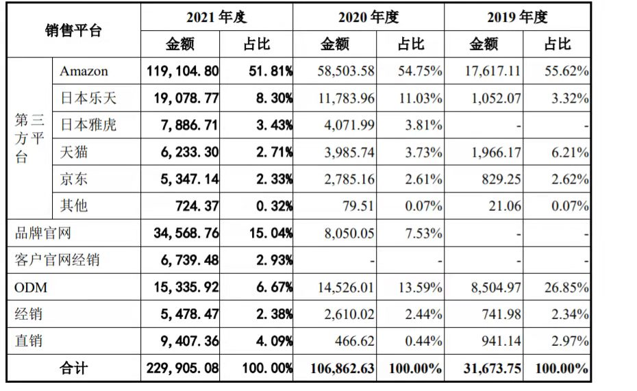 渠道上,華寶新能則主要通過亞馬遜、日本樂天、日本雅虎等第三方平臺銷售產(chǎn)品。2019年至2021年,公司通過這些第三方電商平臺獲得的線上銷售額占總營收比重分別為67.83%、75.99%和68.89%。其中,僅來自亞馬遜的線上銷售額占總營收的比例就達到了51.81%,占據(jù)半壁江山。
