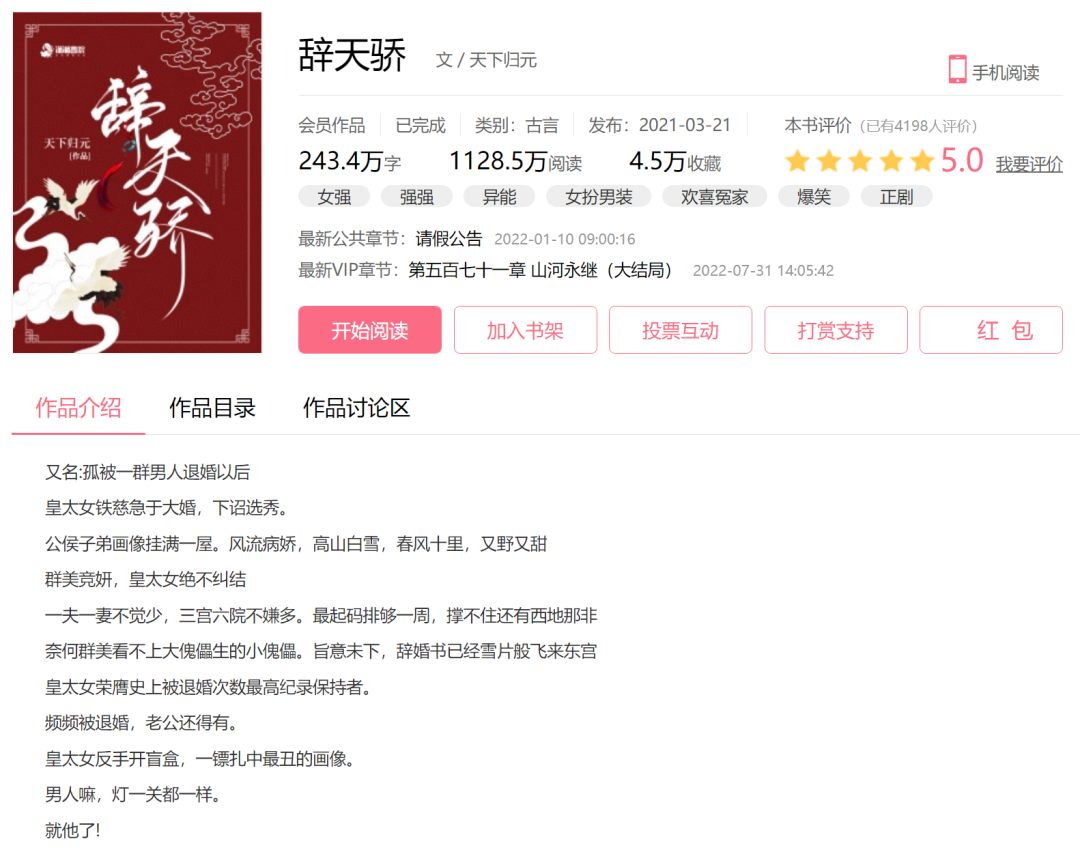 爆款劇集《天盛長歌》《扶搖》原著作者天下歸元的新作《辭天驕》便體現了這一趨勢。小說延續(xù)了她一貫的雙強CP與權謀背景,講述了陰差陽錯成為儲君的女主面對男性當權的朝堂,小心謹慎、獨立自強,將自己的命運握在手中的故事,可謂性轉女帝版《天盛長歌》,具有普世價值觀。