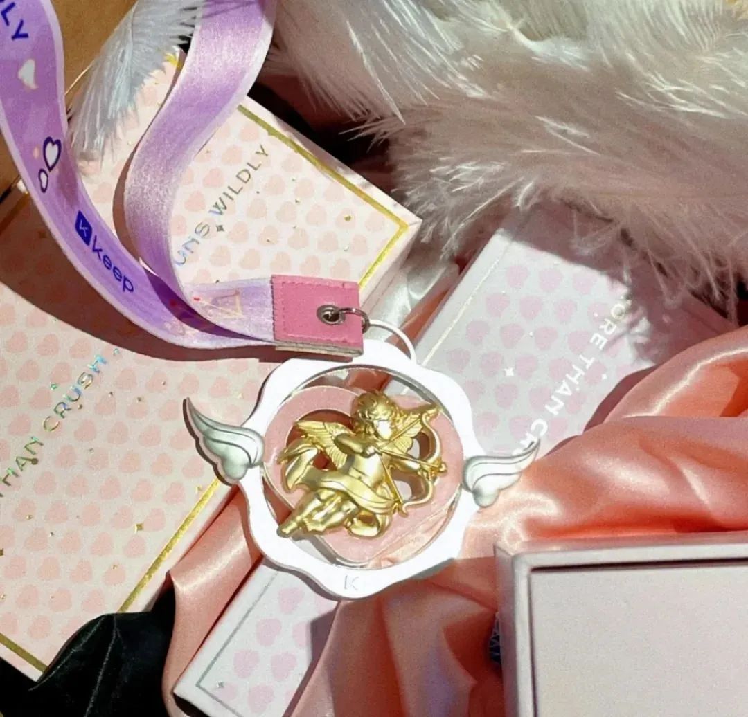 用戶只要完賽,就能收到對(duì)應(yīng)公里數(shù)的丘比特射箭獎(jiǎng)牌。這個(gè)獎(jiǎng)牌以銀白色為基底,粉色愛心作點(diǎn)綴,金色丘比特置身其中,正引弓欲發(fā)。