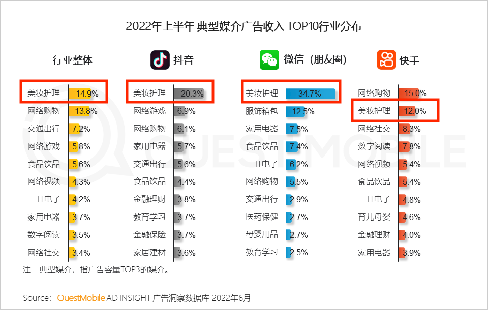 美妝護(hù)膚行業(yè)一向依賴營(yíng)銷,所以即便大環(huán)境不佳,美妝企業(yè)仍保持營(yíng)銷重投入。據(jù)QuestMobile數(shù)據(jù),2022上半年,從抖音、微信朋友圈以及全行業(yè)來(lái)看,來(lái)自美妝護(hù)理行業(yè)的廣告收入貢獻(xiàn)是最高的。
