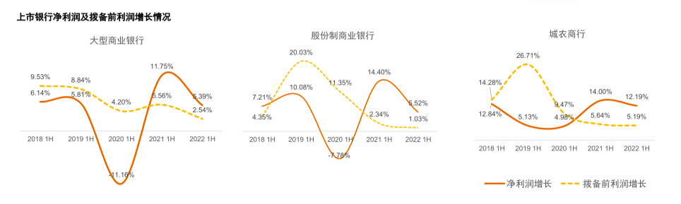 據(jù)《報告》統(tǒng)計,上半年,59家上市銀行的整體凈利潤同比增長6.28%至1.09萬億元,撥備前利潤同比增長2.06%,較2021年同期均略有放緩。其中,大型銀行營收穩(wěn)定,股份制商業(yè)銀行與城農(nóng)商行的利息收入增速放緩,投資收益支持利潤增長。