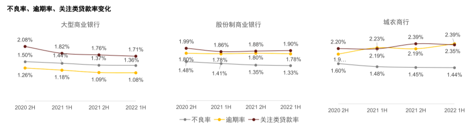 2022年6月末,59家上市銀行的貸款質(zhì)量指標整體保持穩(wěn)健,不良率從2021年末微降0.01百分點至1.36%,關(guān)注類貸款率降0.03百分點至1.84%,逾期率微升0.01百分點至1.42%。