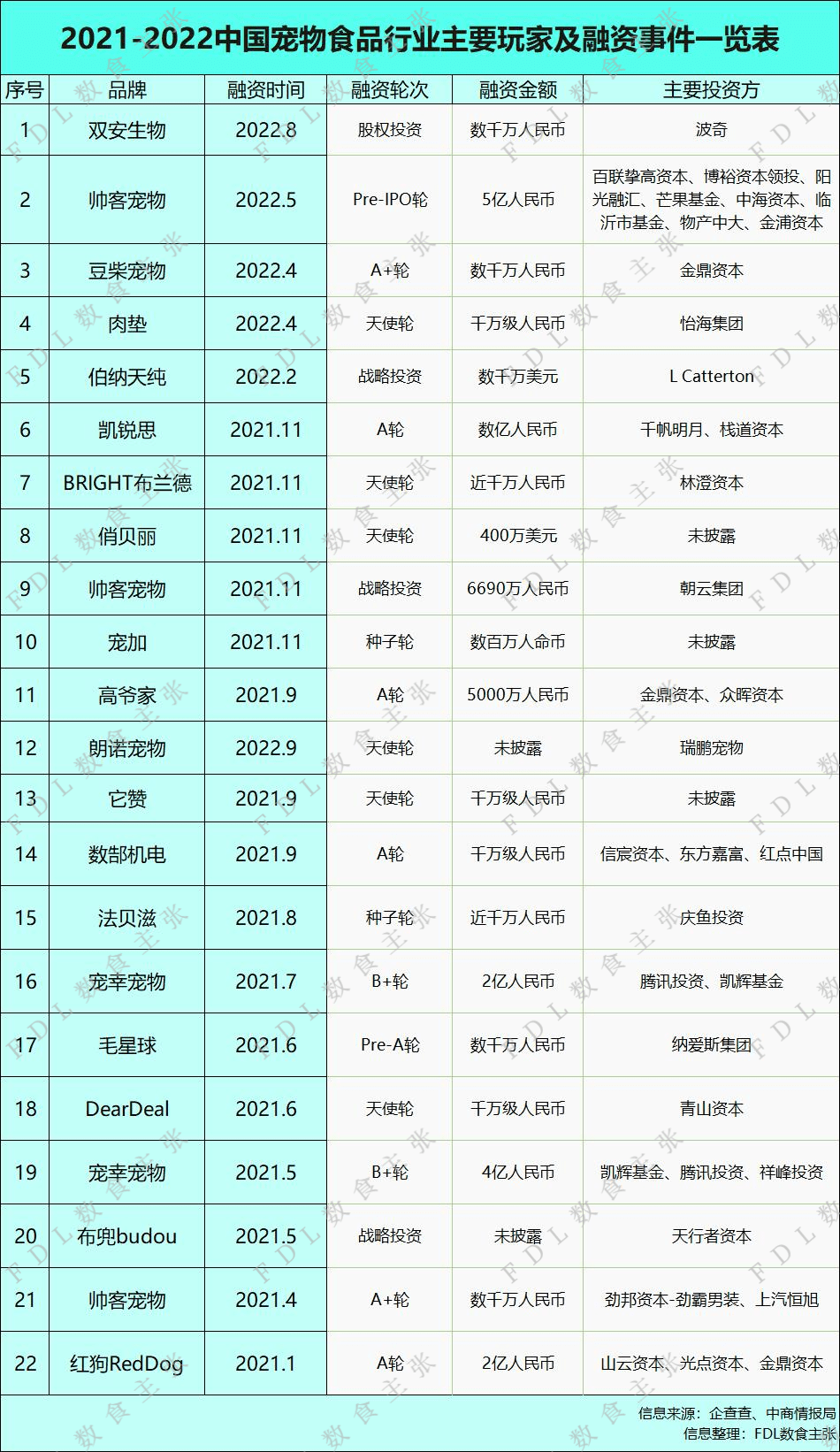 作為寵物行業(yè)收益最大的子行業(yè),寵物食品擁有最穩(wěn)定,消費頻次最高的市場需求,因此也備受資本關(guān)注,成為當之無愧的吸金大戶。近兩年來,我國寵物食品行業(yè)融資頻發(fā),據(jù)數(shù)食主張不完全統(tǒng)計,2021-2022年9月,寵物食品賽道融資事件已達22起,總金額超10億元人民幣。