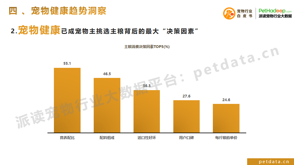 派讀的寵物行業(yè)白皮書顯示,影響鏟屎官為愛寵挑選主糧的因素中,營養(yǎng)配比占比最大,其次是配料組成,且這兩個因素明顯重于其他因素。由此可見,鏟屎官們?yōu)榱俗寣櫸飩兂院?、吃得健康,可謂是操碎了心。