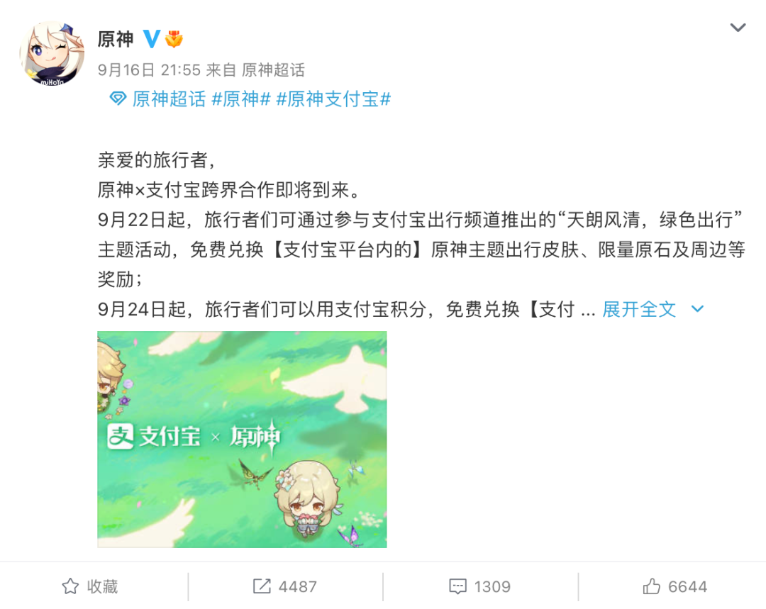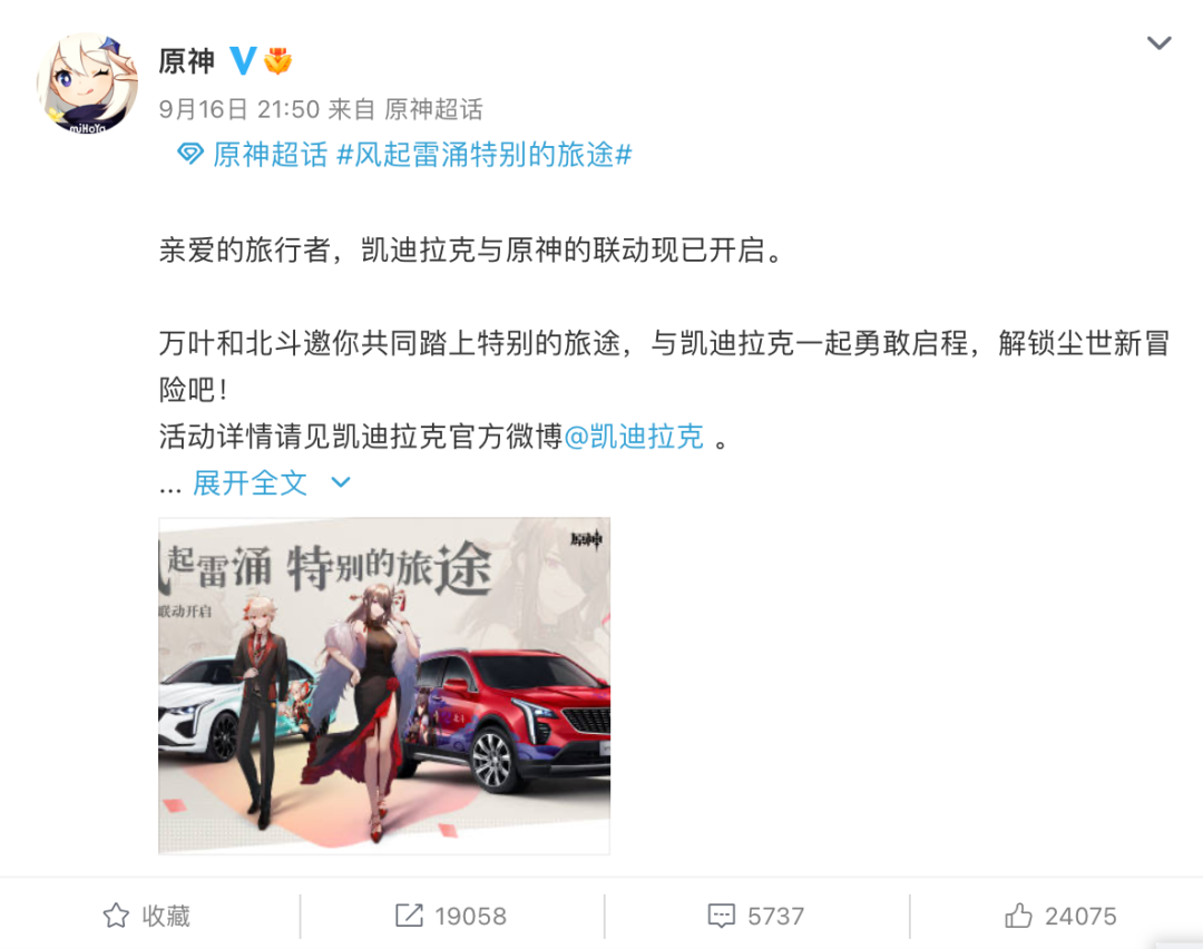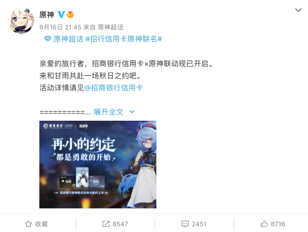最瘋狂當屬9月16號當晚,@原神微博在10分鐘內(nèi)一口氣發(fā)布了聯(lián)動支付寶、凱迪拉克、招商銀行信用卡的活動—— 一天聯(lián)動三次!