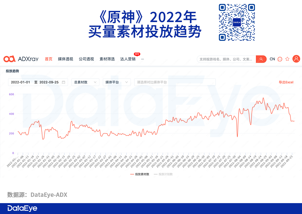 素材投放量:整個暑假,《原神》都加大了素材投放力度,買量素材小幅攀升,在二次元游戲中屬于中等水平。其位列DataEye-ADX近90天中重度游戲中,二次元類的買量TOP13,低于TOP5的《崩壞3》。