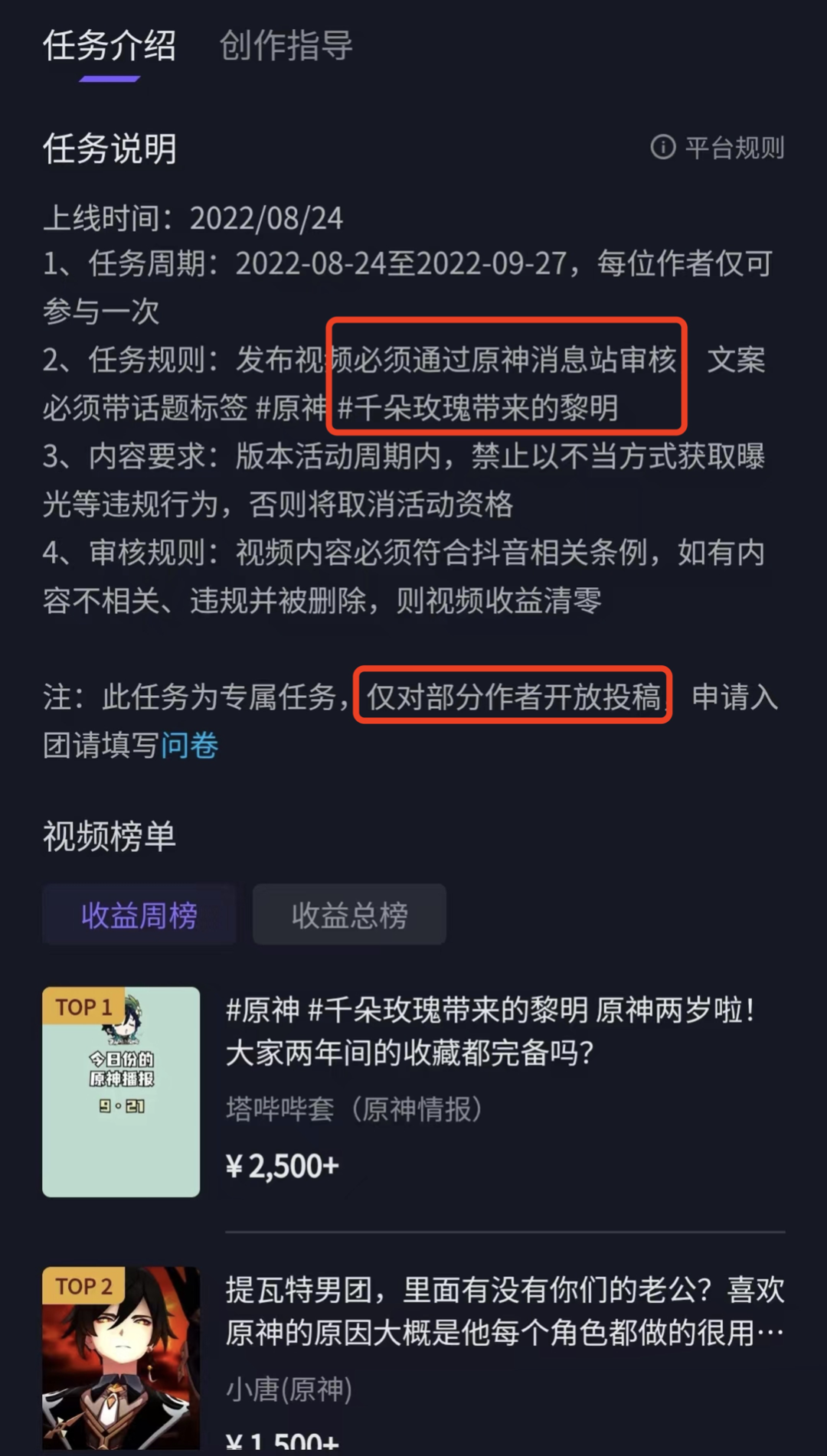 整體思路:《原神》在抖音游戲發(fā)行人計劃的操作,可謂“非主流”:嚴格限制了征集的內(nèi)容、達人。導致目前投稿達人僅22人,視頻數(shù)也僅22條,傳播量僅1640萬。