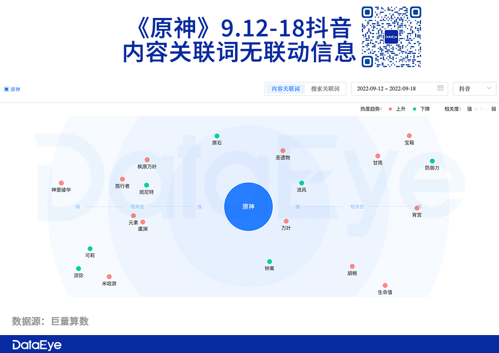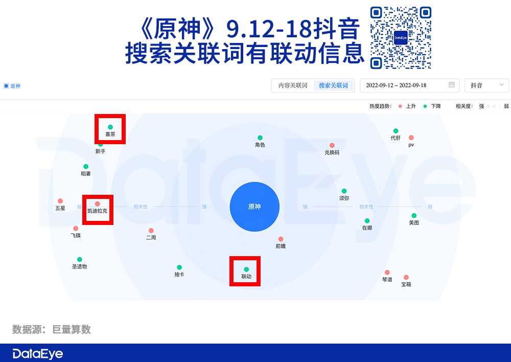 9月12號至18號這一周,是原神聯(lián)動最瘋狂的一周。抖音“原神”的搜索關(guān)聯(lián)詞中,“喜茶”、“凱迪拉克”、“聯(lián)動”都在列;但內(nèi)容關(guān)聯(lián)詞中,卻沒有“聯(lián)動”或品牌關(guān)鍵詞,更多的都是游戲本身相關(guān)詞(數(shù)據(jù)源:巨量算數(shù))——用戶想了解,但相關(guān)內(nèi)容卻不多。