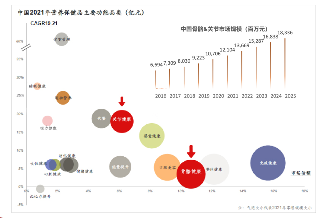 據(jù)Market Research發(fā)布的研究顯示,2020年,美國(guó)骨骼和骨關(guān)節(jié)健康補(bǔ)充劑市場(chǎng)約為27億美元。而在中國(guó)膳食營(yíng)養(yǎng)補(bǔ)充劑市場(chǎng),據(jù)歐睿數(shù)據(jù),在2021年,中國(guó)骨骼關(guān)節(jié)健康類保健品的銷售額達(dá)到了121億元人民幣,年均復(fù)合增長(zhǎng)率17%,而隨著國(guó)內(nèi)老齡化進(jìn)程加劇,銀發(fā)人群基數(shù)擴(kuò)張,歐睿預(yù)測(cè),中國(guó)支持骨骼關(guān)節(jié)健康領(lǐng)域品類將持續(xù)保持兩位數(shù)高增長(zhǎng),預(yù)計(jì)2025年達(dá)到183億元。