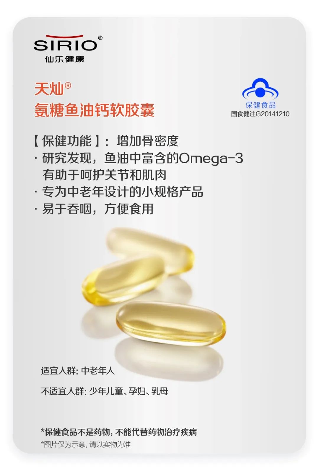 仙樂(lè)健康推出的天燦 氨糖魚油鈣軟膠囊,就創(chuàng)新性地將氨糖與魚油相結(jié)合,在利用氨糖促進(jìn)軟骨基質(zhì)合成的同時(shí),通過(guò)添加含有豐富的n-3高不飽和脂肪酸—EPA和DHA魚油原料,幫助改善骨骼代謝功能,增加骨生成速率,增加骨密度。雙原料的協(xié)同抗炎,也為老人提供了更便捷、復(fù)合的骨關(guān)節(jié)健康方案選擇。此外,考慮到老年人特殊的需求,天燦 氨糖魚油鈣軟膠囊更易吞服的規(guī)格設(shè)計(jì),更是從細(xì)節(jié)處體現(xiàn)了產(chǎn)品的針對(duì)性,全面滿足消費(fèi)者的需求。