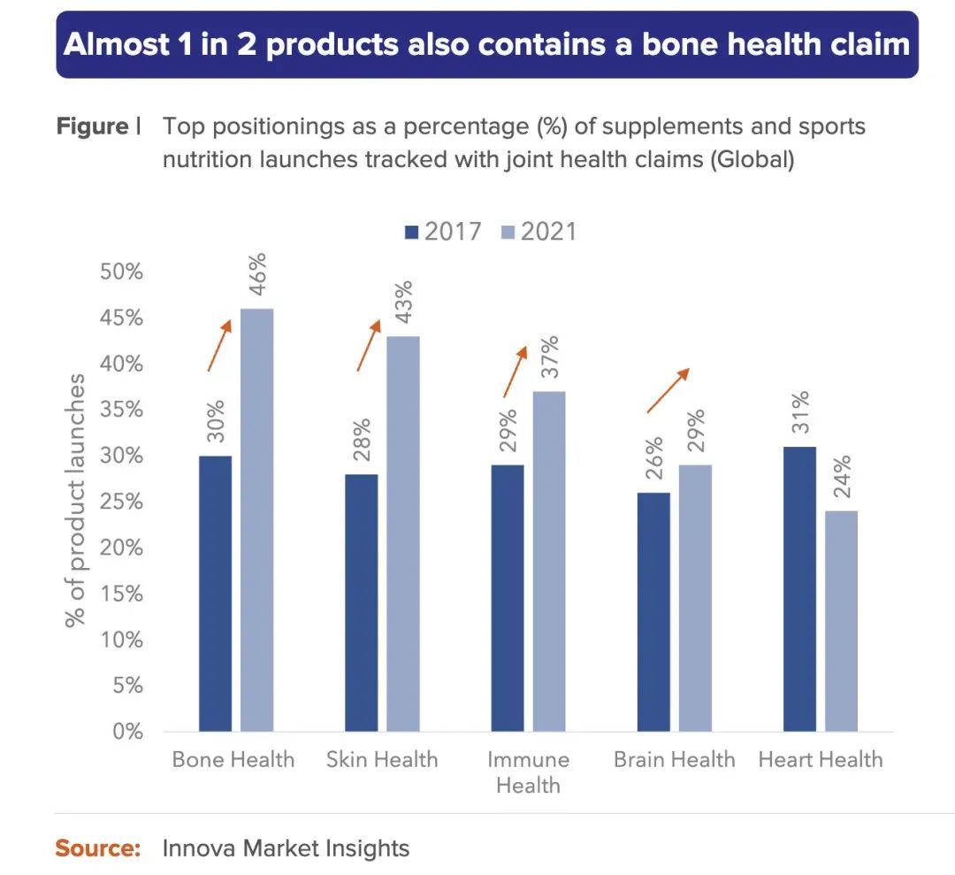 數(shù)據(jù)也表明多場(chǎng)景、多功能綜合性概念在骨關(guān)節(jié)領(lǐng)域的發(fā)展?jié)摿Α?jù)Innova Market Insights調(diào)查顯示,從全球范圍來(lái)看,關(guān)節(jié)健康類產(chǎn)品通常與聲稱具備骨骼、皮膚等營(yíng)養(yǎng)養(yǎng)護(hù)價(jià)值協(xié)同出現(xiàn)。從2017到2021年間,關(guān)節(jié)健康與皮膚健康、免疫健康和腦健康領(lǐng)域的結(jié)合上均呈現(xiàn)出明顯的上漲趨勢(shì)。