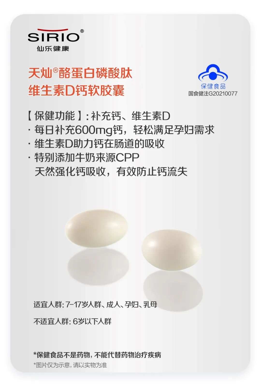針對(duì)這一時(shí)期女性骨骼關(guān)節(jié)具有脆弱性,身體素質(zhì)較低的特點(diǎn)。仙樂(lè)健康的天燦 酪蛋白磷酸肽維生素D鈣軟膠囊富含鈣營(yíng)養(yǎng)素,增加600毫克的日鈣補(bǔ)充量,在考慮到媽媽們高鈣需求的同時(shí)也符合適宜補(bǔ)充含量,避免攝入過(guò)多或不足,科學(xué)陪伴準(zhǔn)媽媽和新手媽媽渡過(guò)這一人生階段。