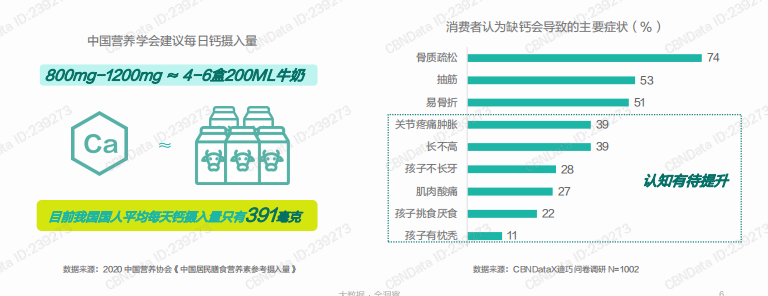 然而,從《2020大眾補(bǔ)鈣觀洞察報(bào)道》的調(diào)查結(jié)果中可以看出,對(duì)于一些較為明顯的骨關(guān)節(jié)營(yíng)養(yǎng)缺乏癥狀如骨質(zhì)疏松、易骨折等,消費(fèi)者的認(rèn)知普遍較強(qiáng),但對(duì)于兒童骨關(guān)節(jié)疼痛、長(zhǎng)不高等癥狀,消費(fèi)者的認(rèn)知僅有39%,兒童補(bǔ)鈣意識(shí)仍待提高。