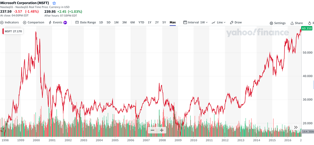 ▲1998~2017年微軟股價變化走勢