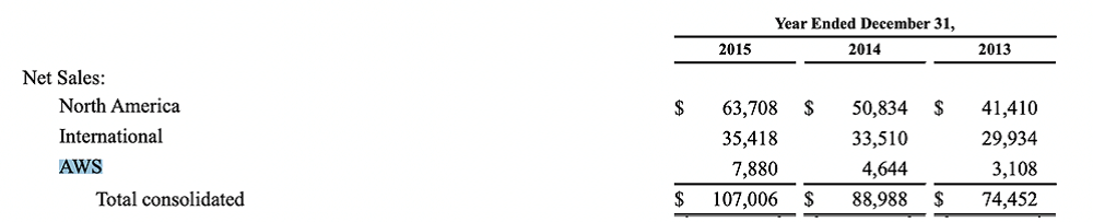 2015年,微軟在財報中合并計算云業(yè)務營收,亞馬遜也改變了云業(yè)務的計算方式。之前,AWS業(yè)務的營收數(shù)據(jù)都是與其他業(yè)務合并計入。直到2015年,AWS業(yè)務的凈銷售額才在財報中單獨列出,為78.88億美元。