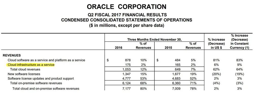 或許是為了掩蓋與亞馬遜這類體量大得多的競爭對手間的差額,2017年第二季度后,甲骨文開始將IaaS業(yè)務與PaaS業(yè)務合并計算營收。