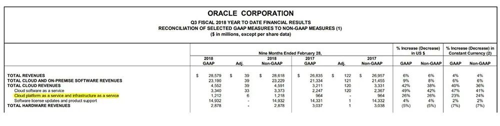 為什么說“又”?甲骨文最近的一次調(diào)整云業(yè)務營收發(fā)生在2017年。當時,甲骨文將財報中的IaaS業(yè)務營收與PaaS(平臺即服務)業(yè)務營收合并計算。