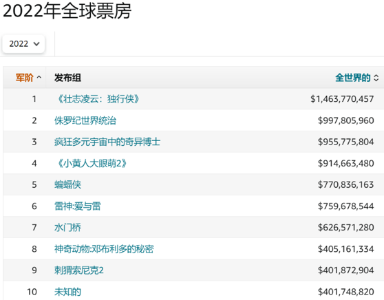 當(dāng)然,論“吸金”能力,好萊塢IP系列大作依然表現(xiàn)強(qiáng)勁。2022年全球票房TOP10中,只有《水門橋》一部不是IP改編電影或IP續(xù)作: