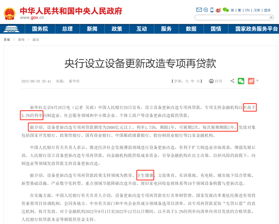9月28日,中國(guó)人民銀行宣布設(shè)立設(shè)備更新改造專項(xiàng)再貸款,額度2000億元以上。衛(wèi)生健康為該政策支持的10個(gè)領(lǐng)域之一。公立和私立醫(yī)院均覆蓋,包括綜合醫(yī)院、??漆t(yī)院、中醫(yī)醫(yī)院、傳染病醫(yī)院、優(yōu)撫醫(yī)院、基層醫(yī)療衛(wèi)生機(jī)構(gòu)等均覆蓋在內(nèi),使用方向主要是開(kāi)展診療、臨床檢驗(yàn)、重癥、康復(fù)、科研轉(zhuǎn)化等醫(yī)療設(shè)備購(gòu)置。