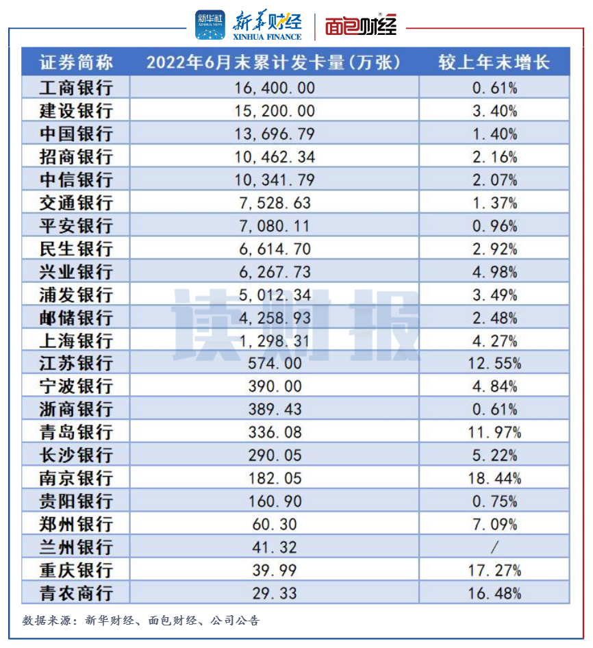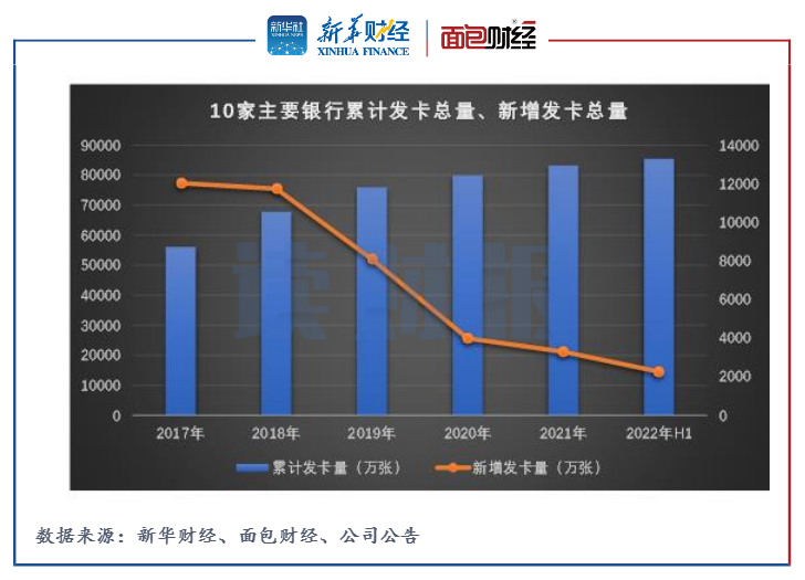 2022年6月末,10家銀行累計發(fā)卡量合計85481萬張,較2021年6月末增加1424萬張,增幅為1.74%,創(chuàng)下近年新低。