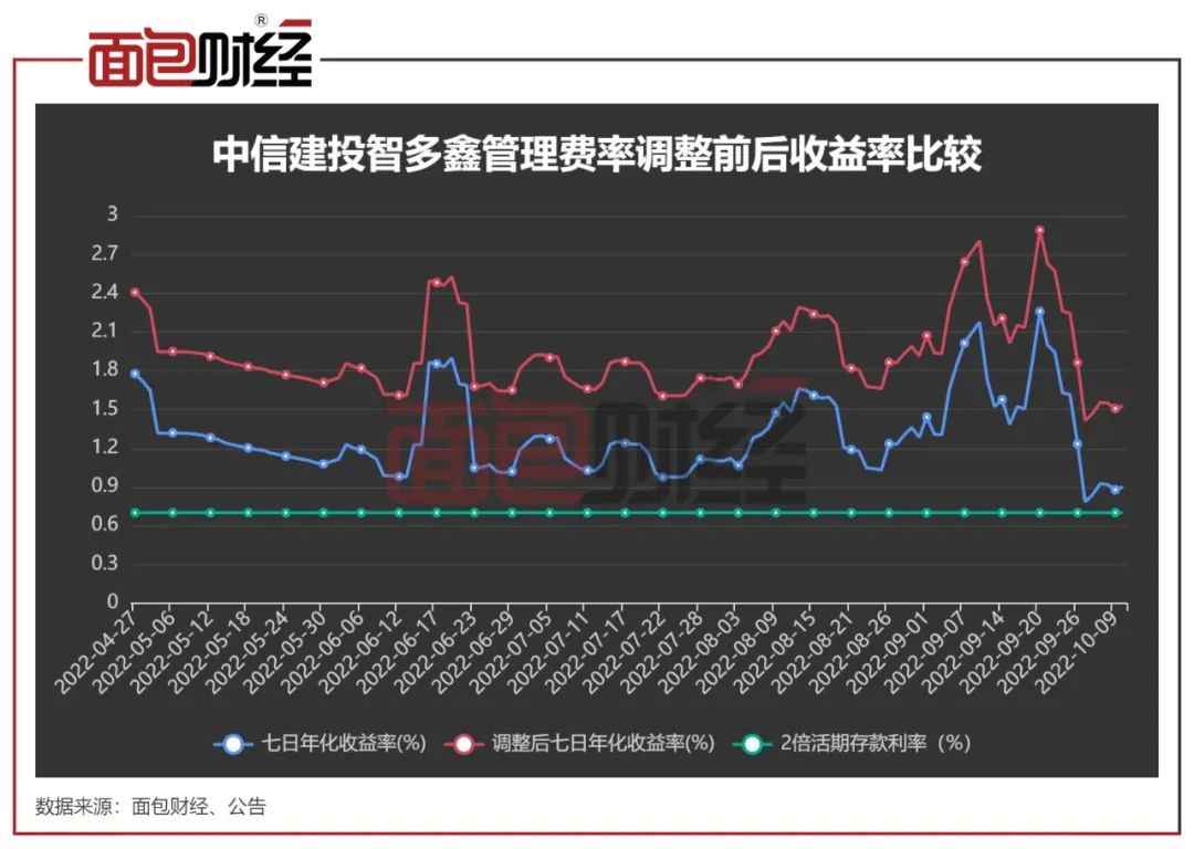 即便業(yè)績(jī)排名靠后,中信建投智多鑫因七日年化收益率均維持在2倍活期存款利率(約0.7%)以上,2022年上半年仍然按照浮動(dòng)費(fèi)率的高檔,即0.9%向投資者收取管理費(fèi)。
