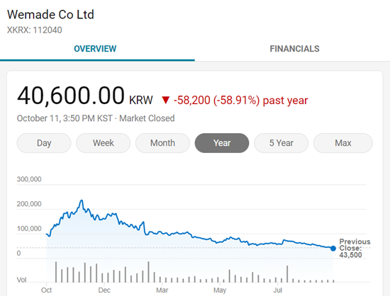 反應在股價上,投資者用腳投票,WeMade股價近一年較高點跌了58.91%。