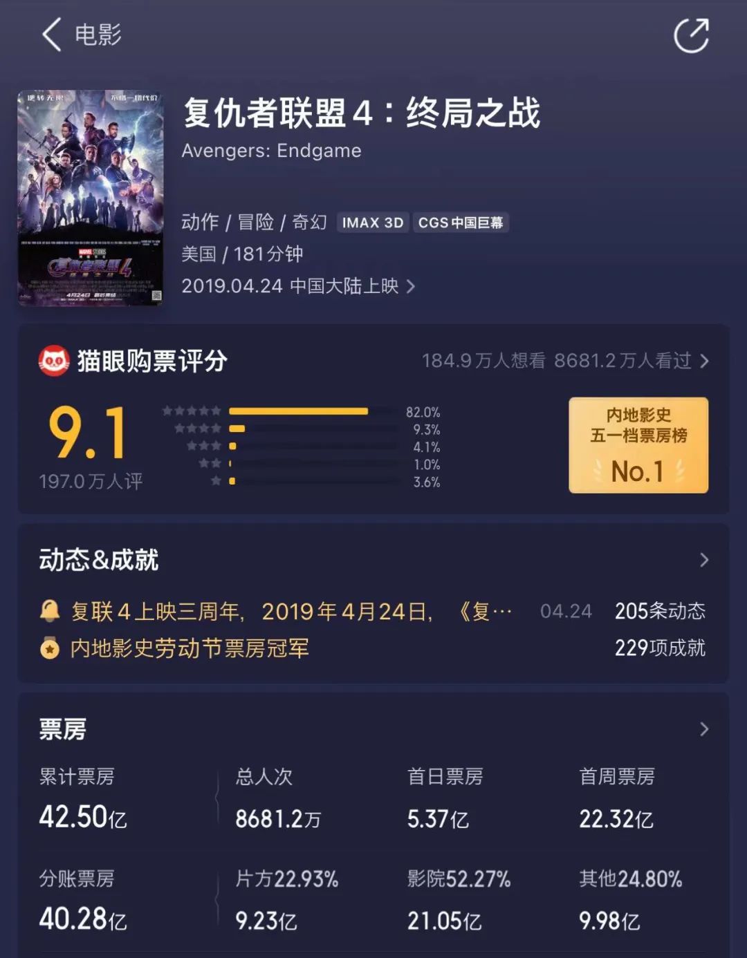 依靠漫威十年布局積累下的強(qiáng)大受眾基本盤,當(dāng)時(shí)該片在內(nèi)地首映時(shí)零點(diǎn)場(chǎng)一票難求,票價(jià)甚至一度上漲至300元乃至更高,成為當(dāng)時(shí)的全民熱點(diǎn)話題。即便如此,觀眾的熱情還是壓倒一切,最后該片票房落點(diǎn)達(dá)到42.5億元。